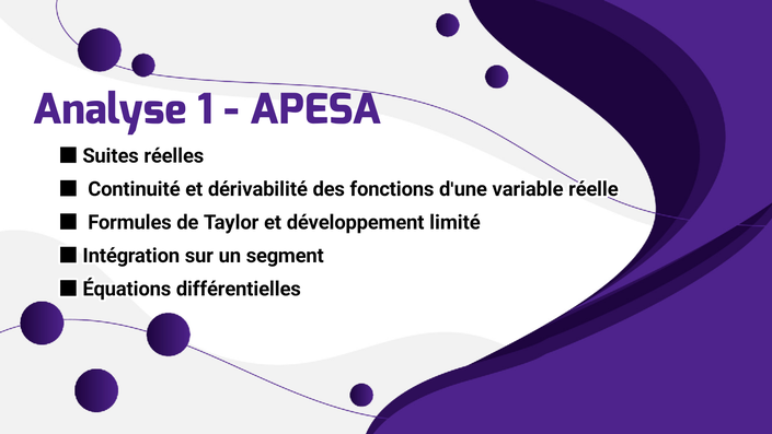 Ce cours d'analyse 1 contient les cours suivants : Nombres réels - Suites numériques - Fonction d'une variable réelle : continuité et Dérivabilité - Formules de Taylor et Développement limité